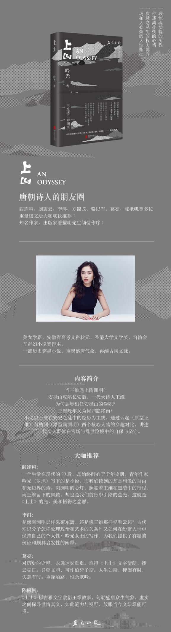 著名作家閻連科表示:“一個生活在現(xiàn)代的90后,卻始終醉心于千年史冊,青年作家吟光(羅旭)寫下的是小說,而我們讀到的卻是想像的自由和無邊界的詩。陶淵明的心燈,照亮著王維在黑暗中的行程;而王維留下的腳跡,卻也是我們前行中引路的螢光。這就是《上山》的光、美和悟得之念愿。”