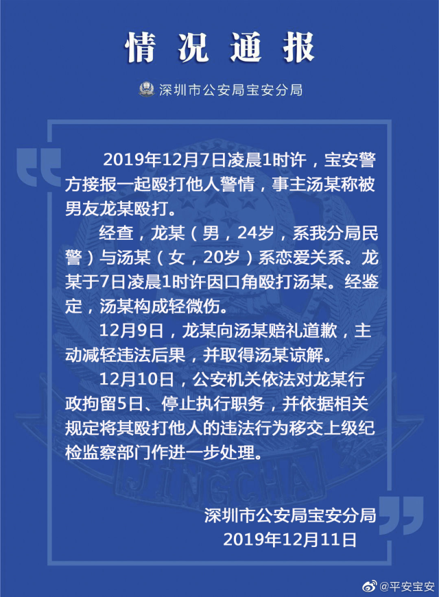 見圳客戶端·深圳新聞網(wǎng)2019年12月12日訊 近日,有媒體報道了深圳女子被男友從家打到樓道,引發(fā)社會廣泛關(guān)注。12月11日,深圳市公安局寶安分局發(fā)布通報稱,家暴施暴男子系寶安分局民警,公安機關(guān)依法對其行拘5日,停止執(zhí)行職務(wù)。