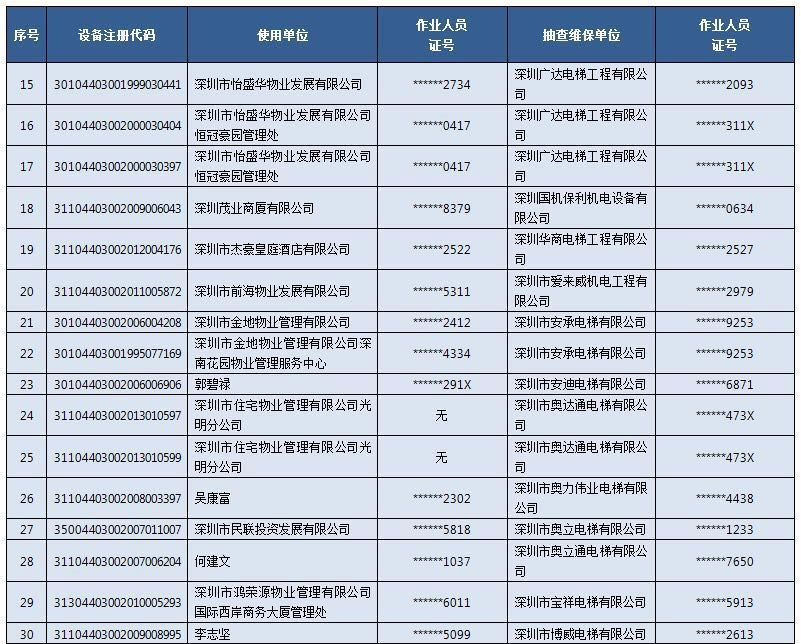 深圳特區(qū)報(bào)2019年12月13日訊 根據(jù)《深圳經(jīng)濟(jì)特區(qū)特種設(shè)備安全條例》第五十條規(guī)定及《深圳市市場(chǎng)監(jiān)督管理局2019年電梯維護(hù)保養(yǎng)質(zhì)量監(jiān)督抽查工作方案》(深市監(jiān)〔2019〕180號(hào)印發(fā))安排,深圳市市場(chǎng)監(jiān)督管理局組織開(kāi)展了電梯維護(hù)保養(yǎng)質(zhì)量監(jiān)督抽查工作,隨機(jī)抽查了5015臺(tái)電梯的維護(hù)保養(yǎng)質(zhì)量,涉及電梯維護(hù)保養(yǎng)單位321家。