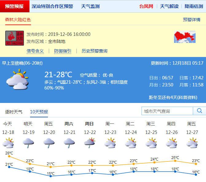 見圳客戶端·深圳新聞網(wǎng)2019年12月18日訊 深圳市氣象局預(yù)計(jì)18日多云,午間天氣溫暖,早晚有輕霧,氣溫21-28℃;19-22日受冷空氣影響,轉(zhuǎn)陰天,部分時(shí)間有分散小雨,氣溫下降,天氣轉(zhuǎn)涼,其中19日沿海、高地陣風(fēng)5-6級(jí);23日多云,可見陽光。森林火險(xiǎn)紅色預(yù)警信號(hào)持續(xù)生效中,請(qǐng)注意森林防火。