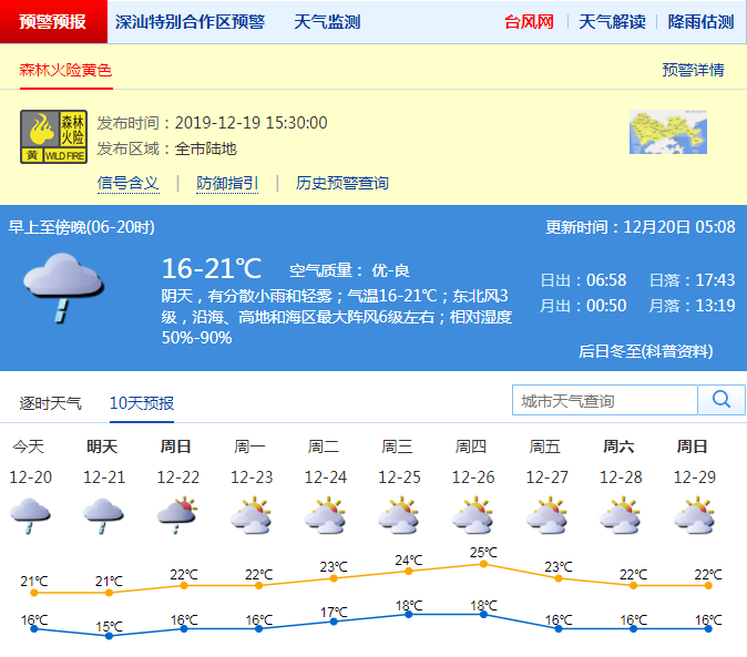 見圳客戶端·深圳新聞網(wǎng)2019年12月20日訊 從18日夜間到19日下午,我市陰天,早晚有輕霧和分散小雨,白天最高氣溫介于20-23℃之間。森林火險紅色預警信號已降級為黃色。