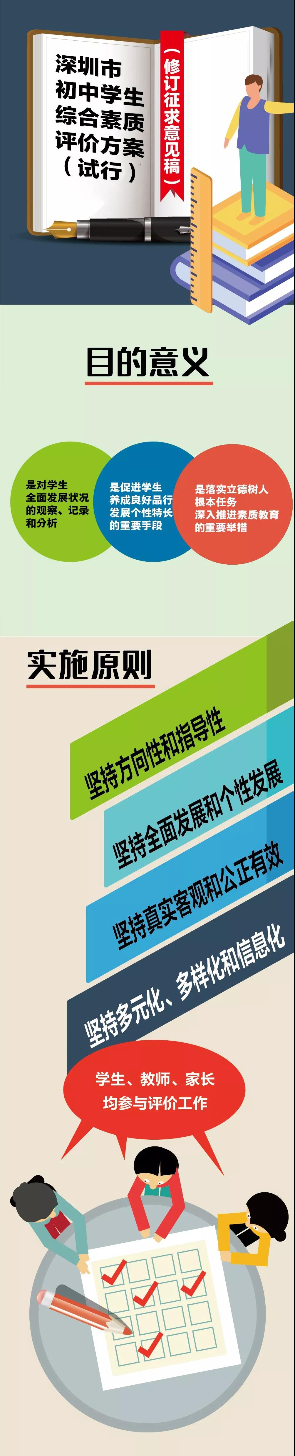 為深入貫徹中共中央、國(guó)務(wù)院《關(guān)于深化教育教學(xué)改革全面提高義務(wù)教育質(zhì)量的意見》和《教育部關(guān)于進(jìn)一步推進(jìn)高中階段學(xué)??荚囌猩贫雀母锏闹笇?dǎo)意見》(教基二〔2016〕4號(hào))、《廣東省教育廳關(guān)于實(shí)施初中學(xué)生綜合素質(zhì)評(píng)價(jià)的指導(dǎo)意見(試行)》(粵教基[2018]10號(hào))等文件精神,落實(shí)立德樹人根本任務(wù),“五育并舉”,促進(jìn)學(xué)生的全面發(fā)展和個(gè)性發(fā)展,根據(jù)工作需要,深圳市教育局于2019年12月11日啟動(dòng)了《深圳市初中學(xué)生綜合素質(zhì)評(píng)價(jià)方案(試行)》的修訂工作。在大量調(diào)研論證、多方征求意見的基礎(chǔ)上,形成了《深圳市初中學(xué)生綜合素質(zhì)評(píng)價(jià)方案(試行)(修訂征求意見稿)》。