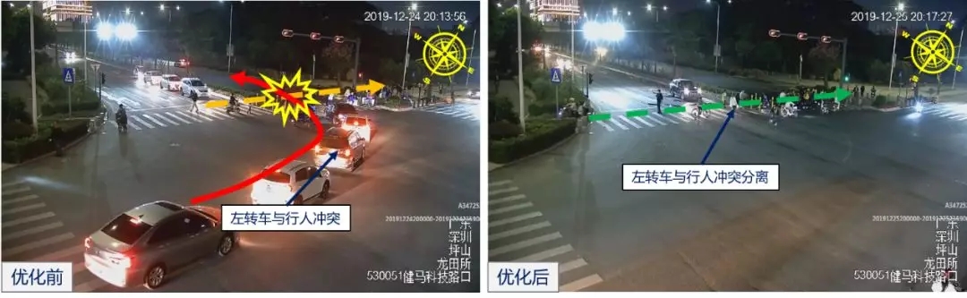 優(yōu)化改善后,路口夜間周期由102秒下降至87秒,路口空放明顯減少;人、車(chē)交叉沖突點(diǎn)數(shù)由2個(gè)減少至0個(gè),基本實(shí)現(xiàn)人車(chē)獨(dú)立通行路權(quán),行人過(guò)街安全得以保障。
