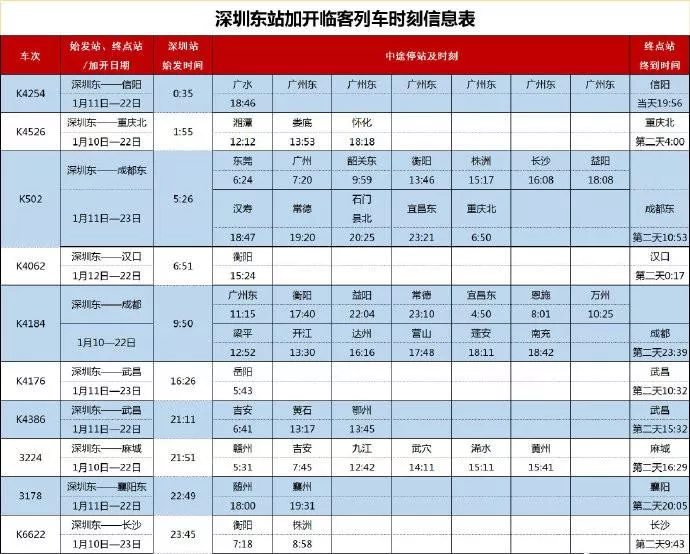 春節(jié)前,深圳站和深圳東站單天將最多加開19趟臨時(shí)長途旅客列車,其中深圳站始發(fā)9趟,深圳東站始發(fā)10趟。