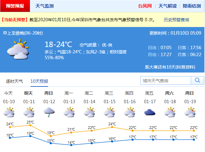 見圳客戶端·深圳新聞網(wǎng)2020年1月10日訊 春運(yùn)首日,深圳天氣如何?深圳市氣象局預(yù)計10-11日多云為主,早晚有輕霧,10日氣溫18-24℃;12日冷空氣影響,轉(zhuǎn)陰天有小雨,沿海、高地和海區(qū)有7級左右陣風(fēng),氣溫下降3-4℃,天氣明顯轉(zhuǎn)涼;13-15日多云到晴天,氣溫逐漸回升。