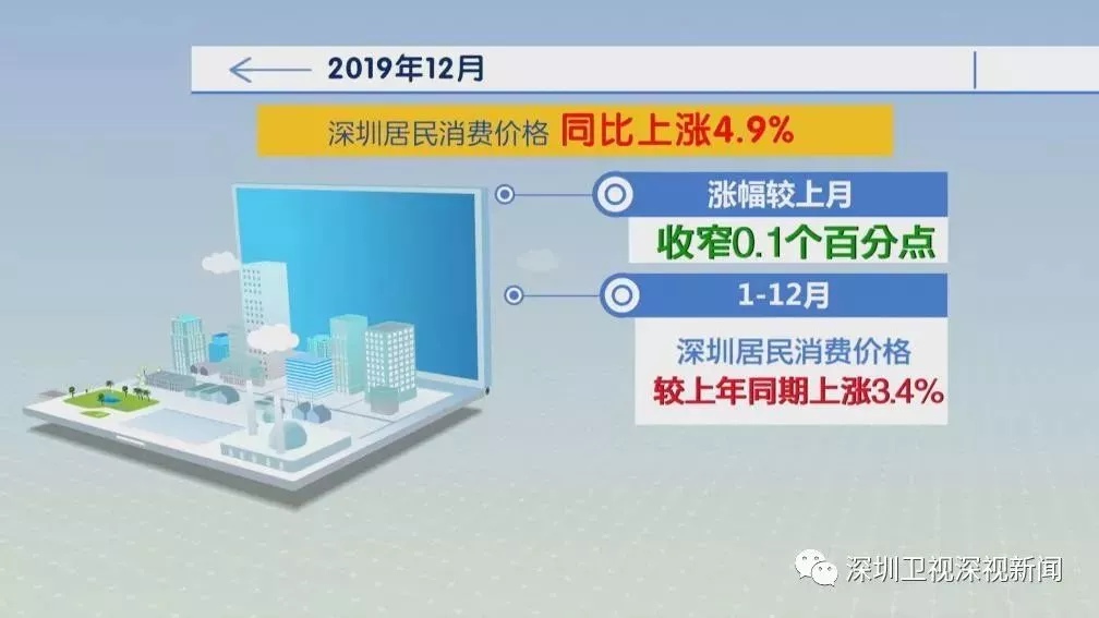 2019年12月份,深圳居民消費價格(CPI)環(huán)比下降0.2%,較上月低0.7個百分點;CPI同比上漲4.9%,漲幅較上月收窄0.1個百分點。1-12月,深圳居民消費價格較上年同期上漲3.4%。