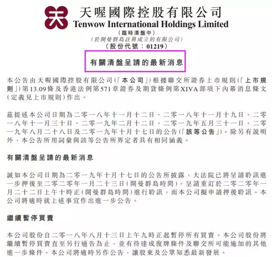 與此同時(shí),天喔國(guó)際更新了自家清盤(pán)呈請(qǐng)的最新消息?!?/p>