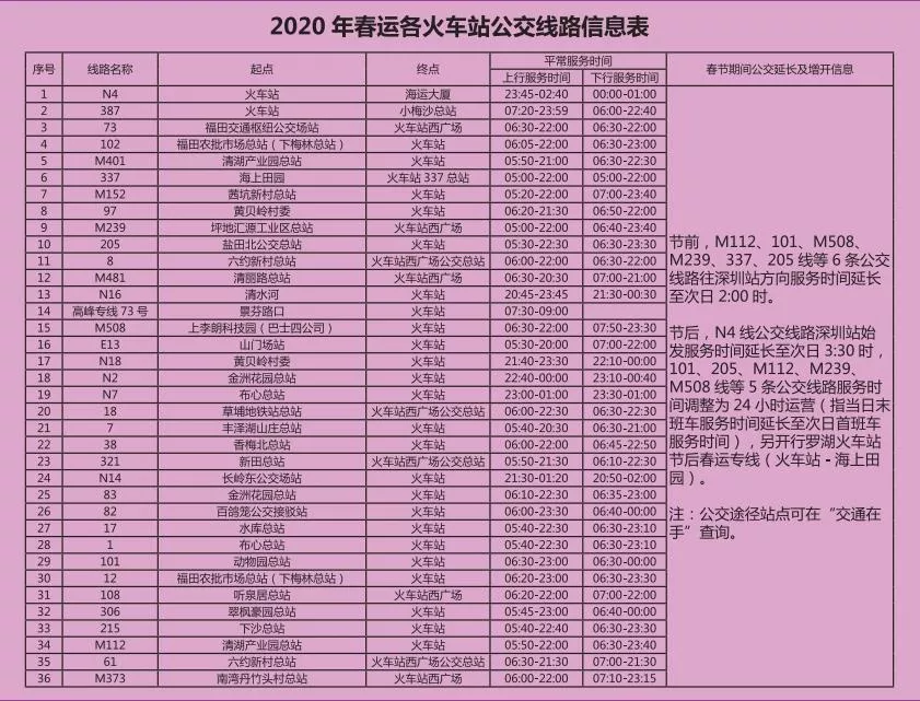 見(jiàn)圳客戶端·深圳新聞網(wǎng)2020年1月20日訊 又將迎來(lái)離深高峰,為方便大伙趕高鐵火車,深圳的公交地鐵都開(kāi)啟最強(qiáng)加班模式,延長(zhǎng)服務(wù)時(shí)間。很多小伙伴就很關(guān)心,途經(jīng)各大火車站的公交線有哪些?運(yùn)營(yíng)的時(shí)間是幾點(diǎn)?