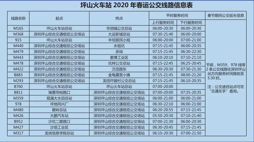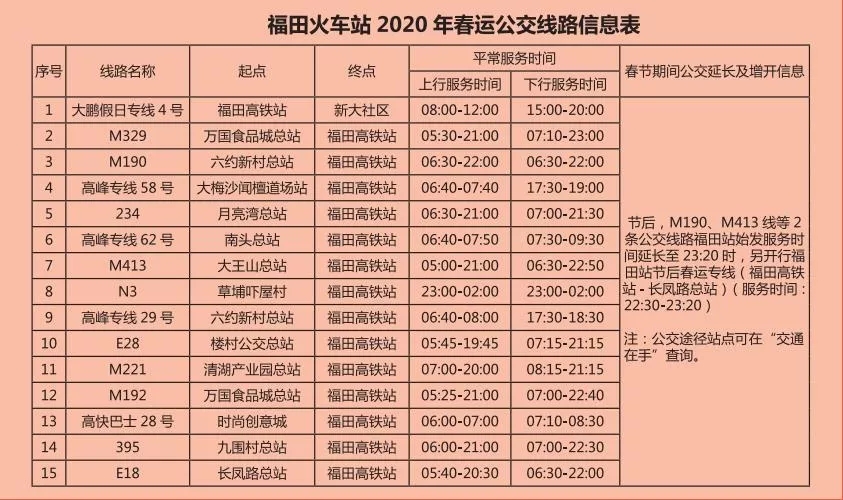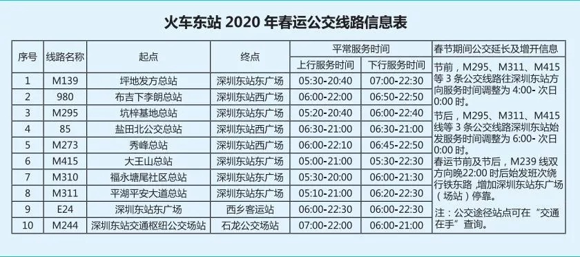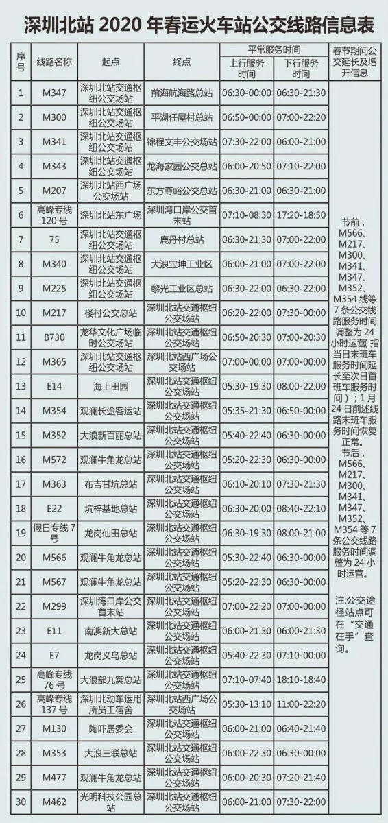 見圳客戶端·深圳新聞網2020年1月20日訊 又將迎來離深高峰,為方便大伙趕高鐵火車,深圳的公交地鐵都開啟最強加班模式,延長服務時間。很多小伙伴就很關心,途經各大火車站的公交線有哪些?運營的時間是幾點?