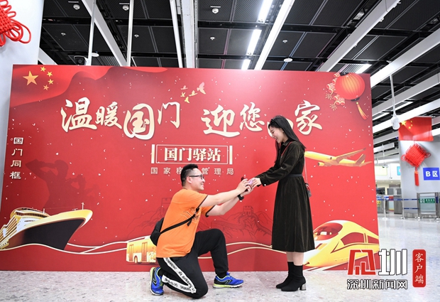 1月20日,西九龍邊檢站“國門驛站”展板前,在邊檢民警的掌聲和祝福中,旅客官先生鄭重向女友宋女士求婚,有情人終成眷屬,“在國門求婚,把愛人帶回家門”成為一段佳話。為營造溫馨喜慶的春節(jié)氛圍,該站在口岸設(shè)置主題活動展板,懸掛節(jié)日裝飾,還研發(fā)小程序,在驗證臺一體機向旅客展示主題海報,令人耳目一新。