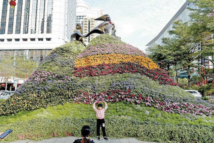 ▲國貿(mào)廣場前"愛神永駐"花塑。