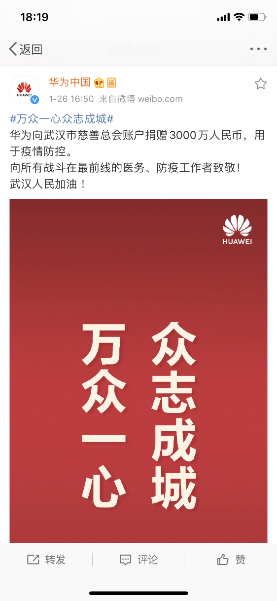 華為表示:“向所有戰(zhàn)斗在最前線(xiàn)的醫(yī)務(wù)、防疫工作者致敬!武漢人民加油!”