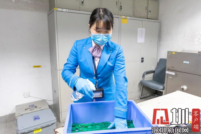 深圳地鐵車站工作人員對地鐵票卡進行消毒。