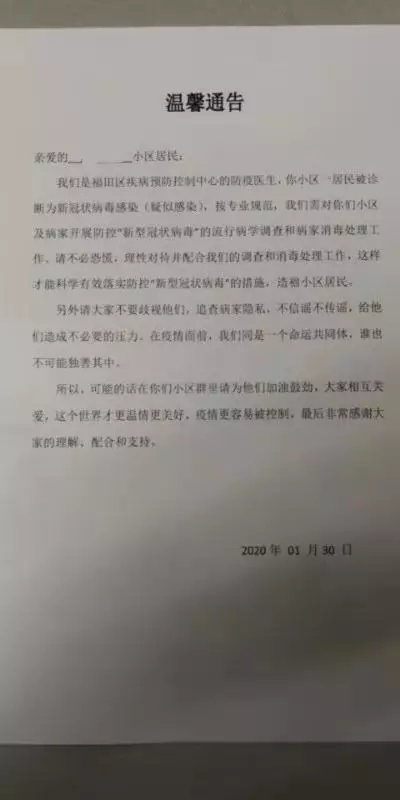 1月30日,由于深圳一小區(qū)出現(xiàn)新冠狀病毒疑似感染病例,福田區(qū)疾病預(yù)防控制中心的防疫醫(yī)生發(fā)布了這則通告。通告除了呼吁小區(qū)居民配合調(diào)查及消毒處理工作外,還特地懇請(qǐng)大家“不要歧視,在疫情面前,我們是同一個(gè)命運(yùn)共同體,誰(shuí)也不可能獨(dú)善其身?!辈恢獮楹?,雖不是湖北人也未曾受過(guò)歧視,但還是被這寥寥數(shù)字的“請(qǐng)求”溫暖了。