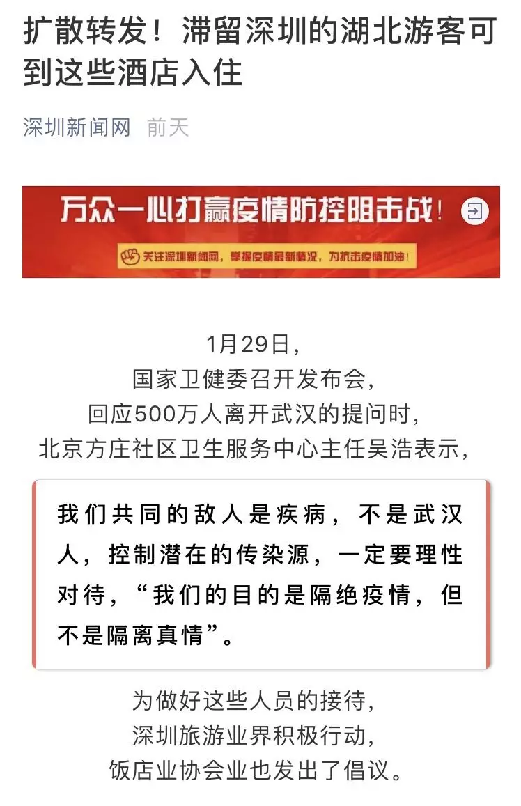 日前深圳就公布了一批指定接待湖北游客的酒店信息,深圳旅游業(yè)界積極行動(dòng),飯店協(xié)會(huì)業(yè)也發(fā)出倡議:疫區(qū)游客是我們的同胞,不僅不能歧視,要伸出援手幫助他們!