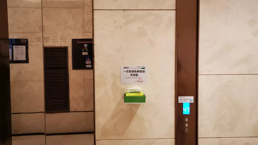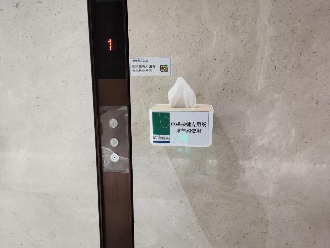 考慮到防控形勢需要,中心對電梯間及按鈕每天至少不低于2次消毒、且每天更換保鮮貼膜外,又于31日在各個電梯廳增設(shè)了一次性抽紙,供乘坐電梯按電梯按鈕時取用。(注:部分樓棟、明天陸續(xù)增設(shè)到位)