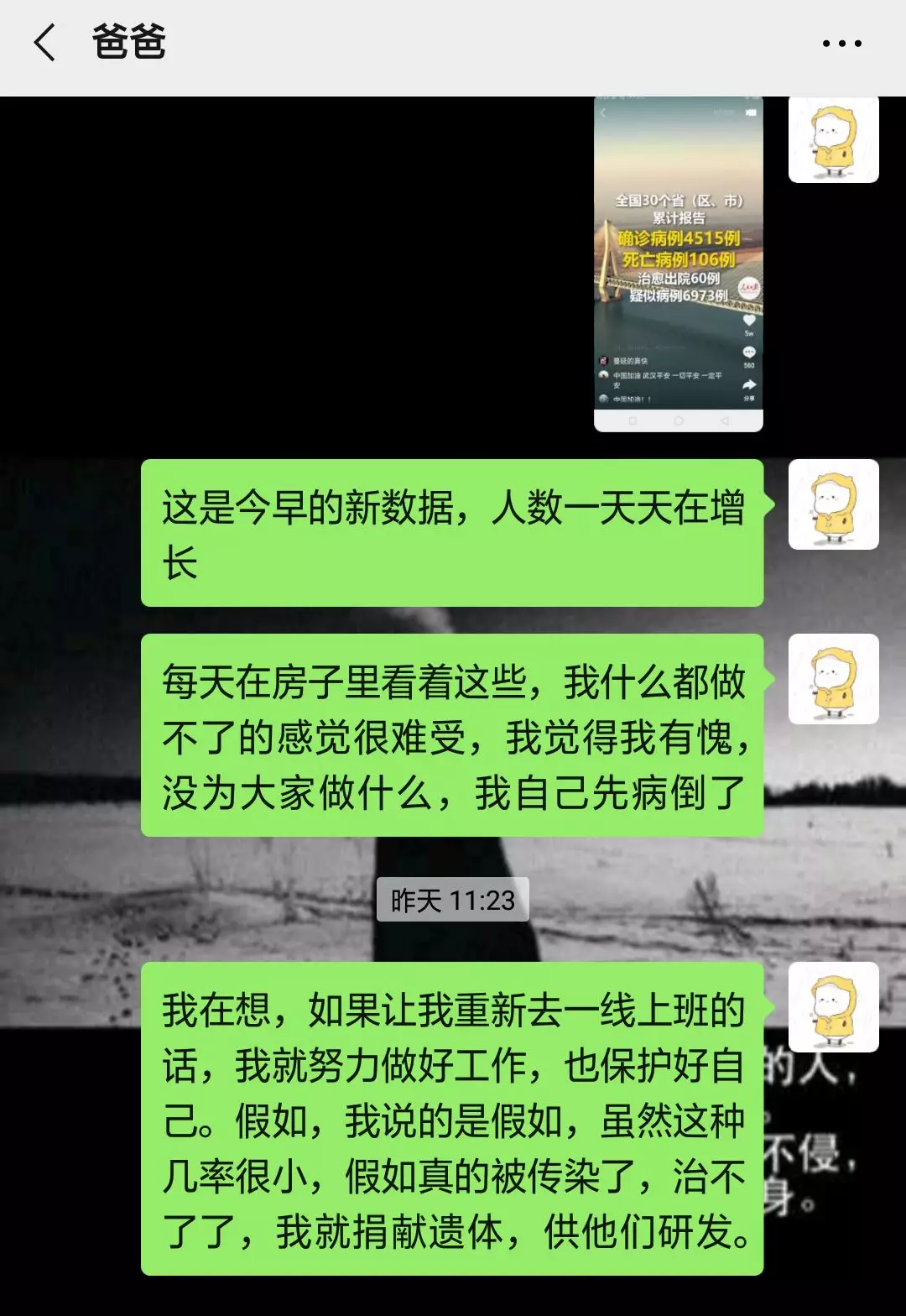 高強度的密閉性工作,李生蘭病倒了,病床上她依然數(shù)次“請戰(zhàn)”。在發(fā)給爸爸的微信中,她寫道,“假如我倒在了崗位上,請捐獻(xiàn)我的遺體!”把我的遺體捐獻(xiàn),我希望能為這次疫情做點什么!