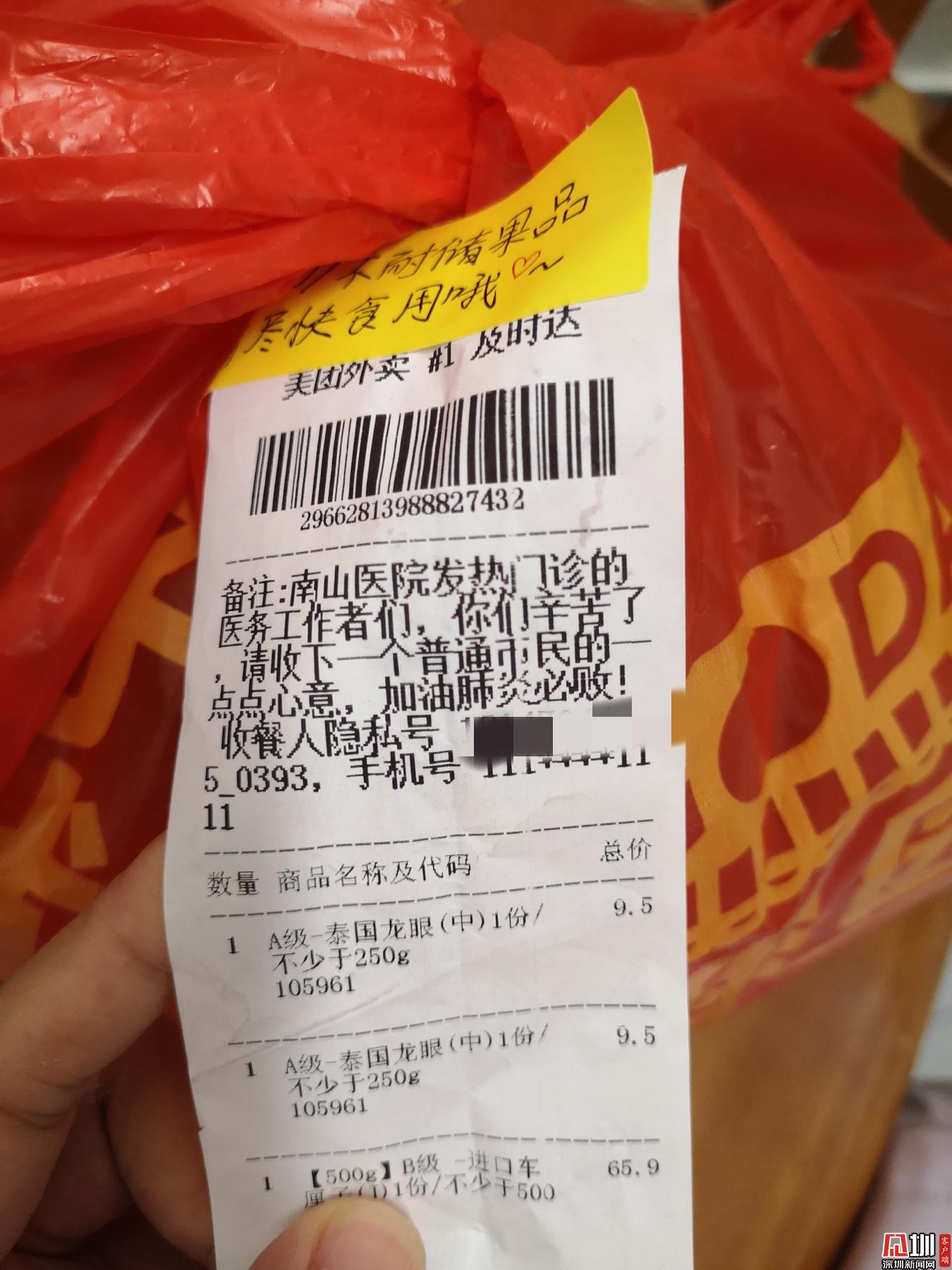見圳客戶端·深圳新聞網(wǎng)2020年2月1日訊 (見圳客戶端、深圳新聞網(wǎng)記者 劉夢婷 通訊員 深協(xié)和)“老淚縱橫!”1月30日晚上8點56分,華中科技大學(xué)協(xié)和深圳醫(yī)院(南山醫(yī)院)手外科護(hù)士王敏在朋友圈曬了一張照片,瞬時網(wǎng)友們紛紛點贊。照片里是一個紅色塑料袋上貼著一張外賣單,備注上寫著,“南山醫(yī)院發(fā)熱門診的醫(yī)務(wù)工作者們,你們辛苦了!請收下一個普通市民的一點點心意,加油,肺炎必??!”