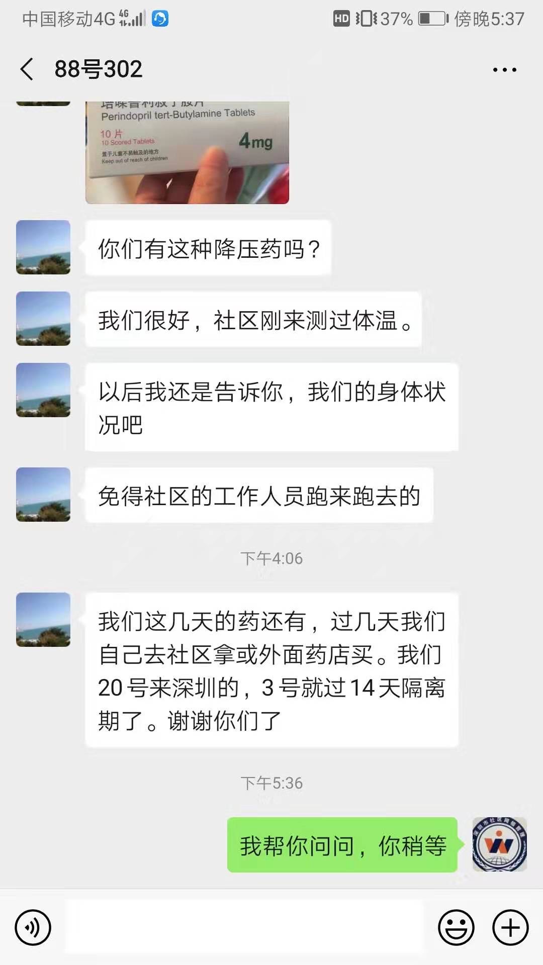 社區(qū)網(wǎng)格員與居家隔離人員“一對一”微信服務(wù),提供幫助。