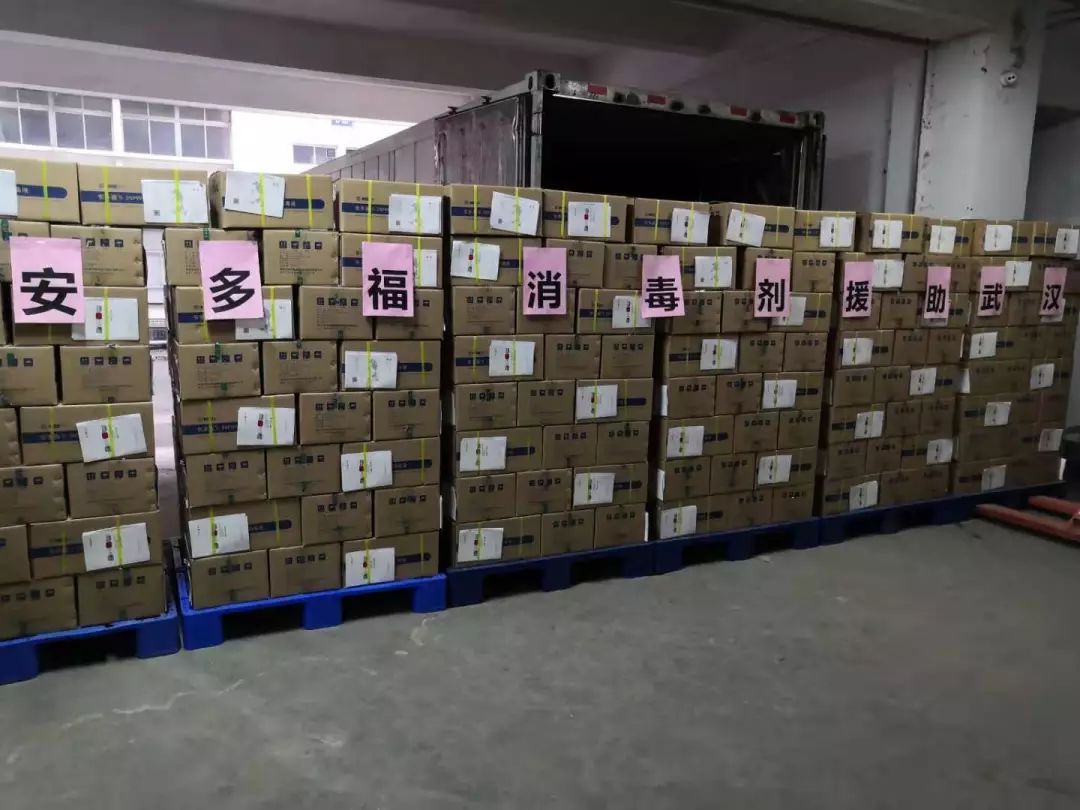 1月25日(大年初一)下午,安多福公司緊急向向武漢援助500箱共12000瓶專業(yè)醫(yī)用消毒液,總價值564000元,連夜從深圳馳援武漢,用于保障疫情防控一線的醫(yī)護人員安全。