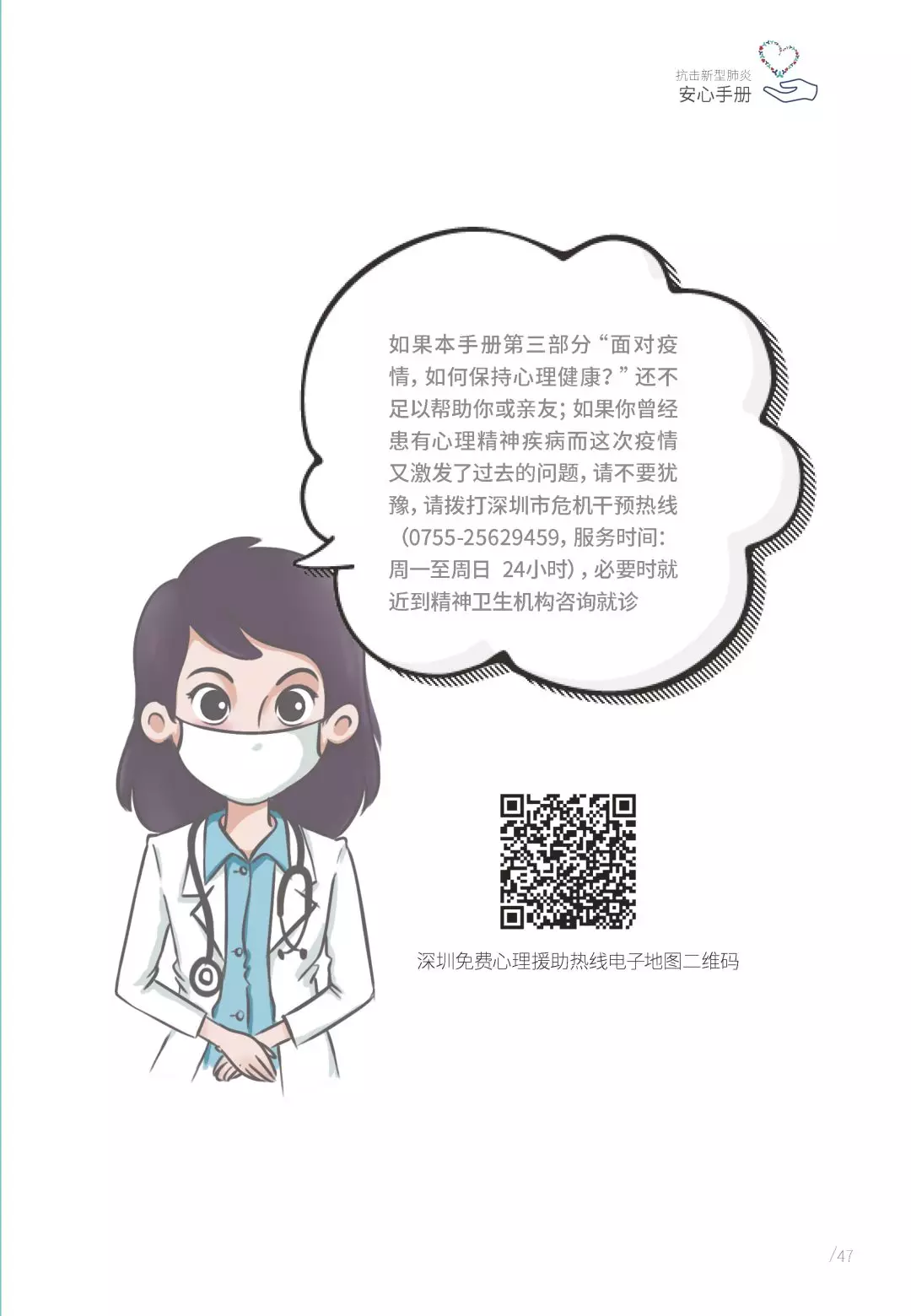 抗擊新型肺炎“安心手冊(cè)”由深圳市精神衛(wèi)生中心/深圳市康寧醫(yī)院支持,深圳市康寧醫(yī)院始建于1980年,是深圳市唯一一家集預(yù)防、醫(yī)療、康復(fù)、科研、教學(xué)于一體的公立三甲精神病??漆t(yī)院。2010年以來(lái),醫(yī)院連續(xù)九年名列復(fù)旦大學(xué)醫(yī)院管理研究所中國(guó)最佳專科排行榜精神??漆t(yī)院前十位;2017年榮膺第五屆全國(guó)文明單位;2019年精神科獲評(píng)廣東省高水平臨床重點(diǎn)??啤at(yī)院服務(wù)在各類顧客體驗(yàn)度和公眾滿意度測(cè)評(píng)中,名列前茅。