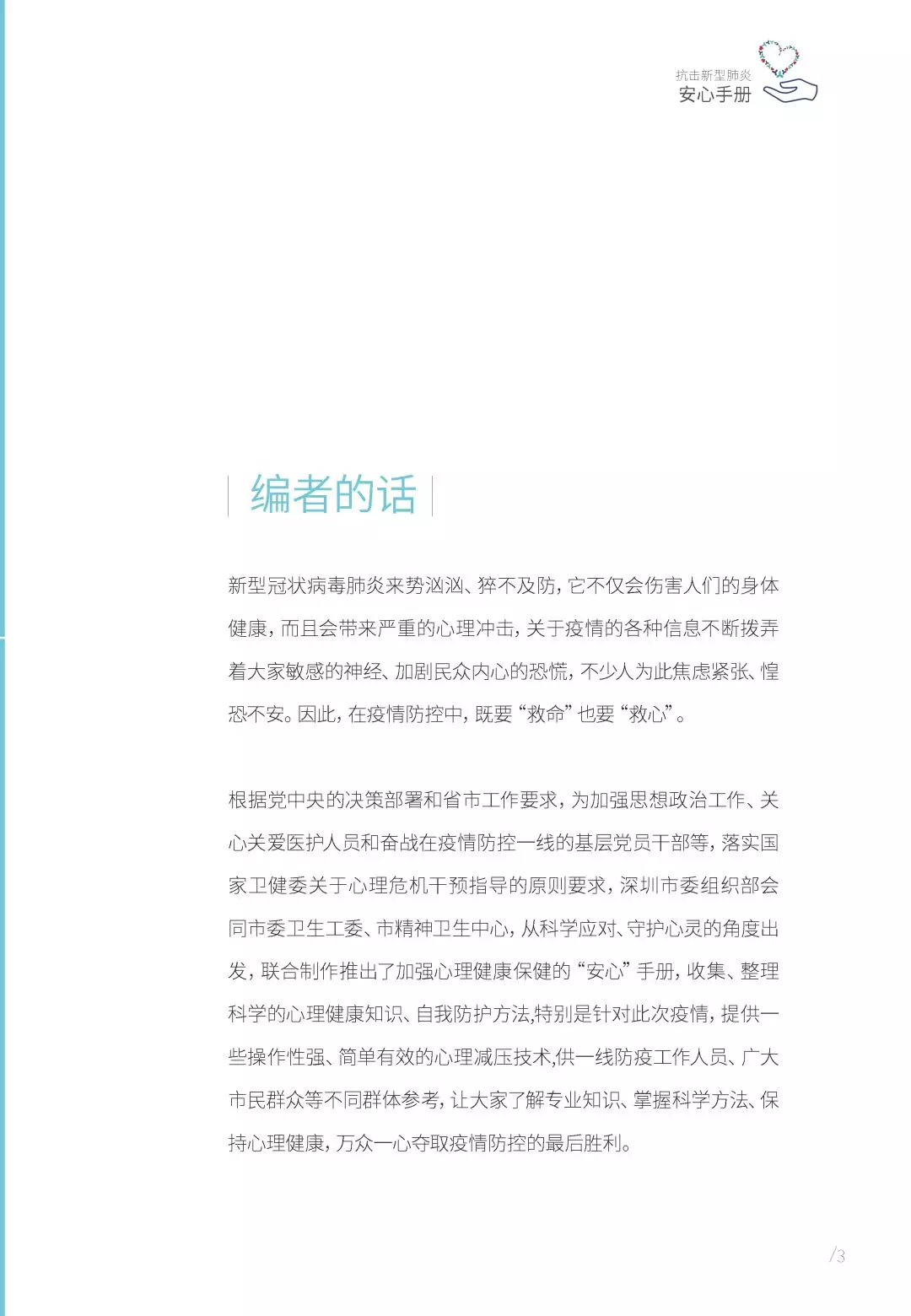 根據(jù)黨中央的決策部署和省市工作要求,為加強(qiáng)思想政治工作、關(guān)心關(guān)愛(ài)醫(yī)護(hù)人員和奮戰(zhàn)在疫情防控一線的基層黨員干部等,落實(shí)國(guó)家衛(wèi)健委關(guān)于心理危機(jī)干預(yù)指導(dǎo)的原則要求,深圳市委組織部會(huì)同市委衛(wèi)生工委、市精神衛(wèi)生中心,從科學(xué)應(yīng)對(duì)、守護(hù)心靈的角度出發(fā),聯(lián)合制作推出了加強(qiáng)心理健康保健的“安心”手冊(cè),收集、整理科學(xué)的心理健康知識(shí)、自我防護(hù)方法,特別是針對(duì)此次疫情,提供一些操作性強(qiáng)、簡(jiǎn)單有效的心理減壓技術(shù),供一線防疫工作人員、廣大市民群眾等不同群體參考,讓大家了解專業(yè)知識(shí)、掌握科學(xué)方法、保持心理健康,萬(wàn)眾一心奪取疫情防控的最后勝利。