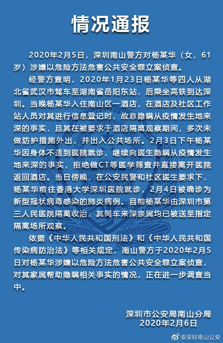 依據(jù)《中華人民共和國刑法》和《中華人民共和國傳染病防治法》等相關(guān)規(guī)定,南山警方于2020年2月5日對楊某華涉嫌以危險(xiǎn)方法危害公共安全罪立案偵查,對其家屬幫助隱瞞相關(guān)事實(shí)的情況,正在進(jìn)一步調(diào)查中。