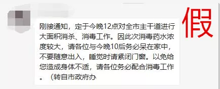 傳言稱,深圳定于今晚12點對全市主干道進行大面積消殺、消毒工作。因消毒藥水濃度較大,請市民于今晚10點后務必待在家中,不要隨意出入,睡覺時請緊閉門窗。