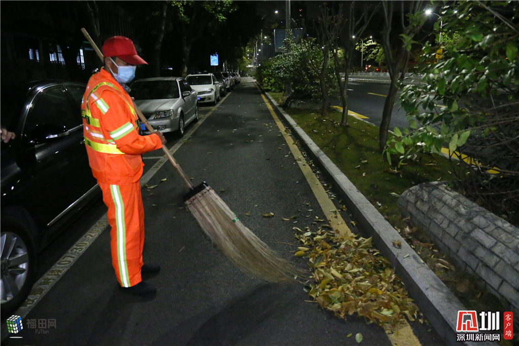 來自湖南的田朝勝,在清潔工人這個崗位已經(jīng)工作10年,每天清晨他都在清掃著這個片區(qū)路面,地面上泛黃的葉子在黑夜里被他掃的沙沙作響。他說,疫情期間,很多環(huán)衛(wèi)人員回老家后再想回深圳就沒那么容易了,有很多老鄉(xiāng)被隔離了回不來?!跋M蹅兊娜兆于s快好起來吧,2020年一天比一天過得好。”田朝勝感慨到。