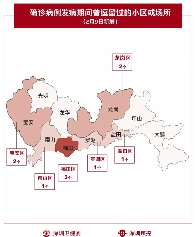 2月9日,疾控專業(yè)人員通過(guò)最新的流行病學(xué)調(diào)查確認(rèn),深圳新增10個(gè)小區(qū)(場(chǎng)所),有新確診的病人在出現(xiàn)病征期間曾經(jīng)逗留。