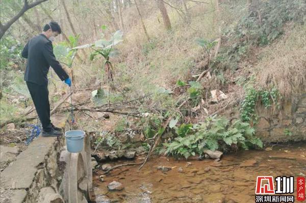 工作人員對(duì)飲用水源支流水質(zhì)進(jìn)行采樣。