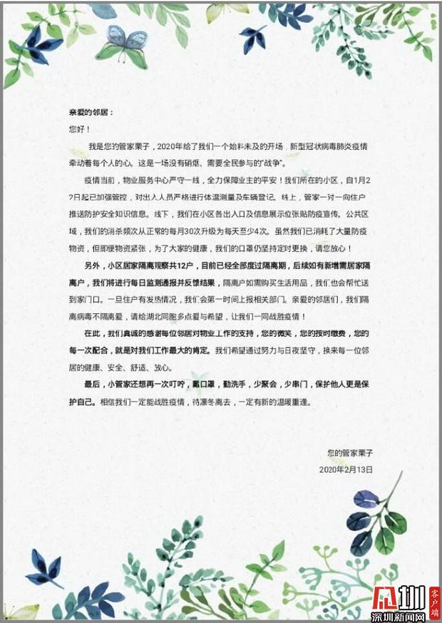 見圳客戶端·深圳新聞網(wǎng)2020年2月13日訊(見圳客戶端·深圳新聞網(wǎng)記者 潘潤華)“他們對疫情的恐懼并不少半分,可卻堅(jiān)持在工作崗位。”“他們就是我們心目中的逆行者。守護(hù)著我們的安全?!苯?,一幕幕暖心畫面在深圳上演,不少業(yè)主紛紛踴躍為物業(yè)員工捐款,以表達(dá)對這些“平安守護(hù)者”“逆行人”的謝意。