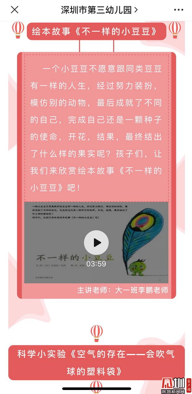 深圳市第三幼兒園園長邱雪華訴記者:“目前,三幼已經(jīng)開啟線上教學(xué)活動,我們充分運用公眾號、微信群等網(wǎng)絡(luò)平臺,與家長、幼兒充分互動,陸續(xù)推出具有健康促進特色的圖文推送,其中包括介紹防疫常識的攻略、由園長主講的園長電臺,還創(chuàng)辦了每日一期的原創(chuàng)系列游戲,以便家長在家也能獲取適宜的親子游戲活動資源。”記者在深圳市第三幼兒園的微信公眾平臺上看到,幼兒園線上互動內(nèi)容豐富,其中包括視頻繪本故事、科學(xué)小實驗以及親子體育游戲。每個版塊均由深圳市第三幼兒園老師們主講示范并錄制視頻,便于孩子及家長學(xué)習(xí)。