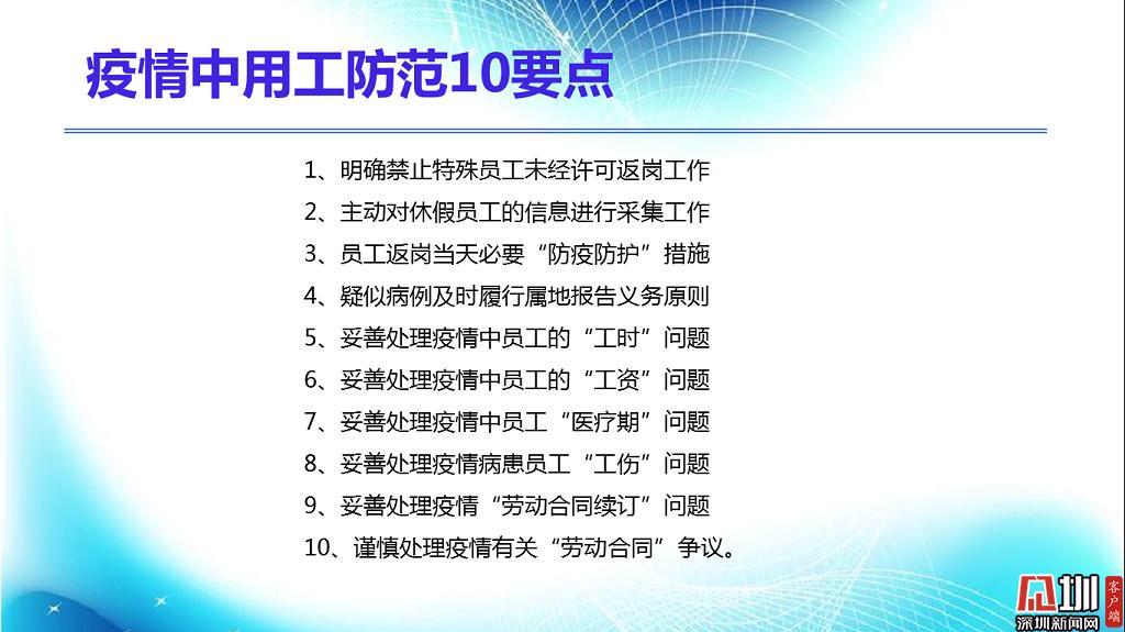 見圳客戶端?深圳新聞網(wǎng)2020年2月18日訊(見圳客戶端、深圳新聞網(wǎng)記者 焦慧茹)疫情影響了社會的方方面面,給企業(yè)和職工帶來了新的問題。對于廣大職工而言,擔心的是疫情期間工資發(fā)放、復工安排等。對于企業(yè)而言,擔心的是如何順利復工復產(chǎn)。為此,深圳市總工會聯(lián)合深圳新聞網(wǎng)推出“復工防疫微課堂”第六期,邀請講師楊文浩,分析、整理了疫情之下企業(yè)復工用工防范要點,幫助大家解決困惑。