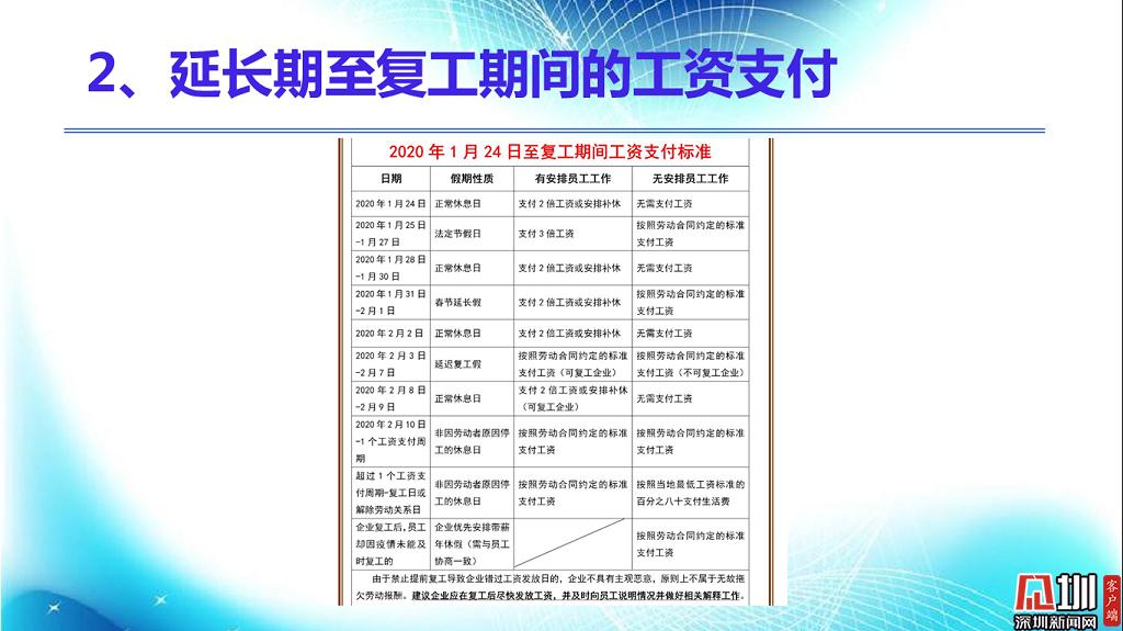 延長期至復工期間的工資支付問題。延期提前開工,足額支付、加班雙倍;延期正常開工,遵循法規(guī)、正常出勤;開工停工停業(yè),首月按照勞動合同規(guī)定正常支付,次月遵法即可;在家網(wǎng)上開工,工資照常應照常發(fā)放;開工不足機制,輪崗待崗、假期協(xié)商;遵守當?shù)胤ㄒ?guī),因地制宜,和諧有道。
