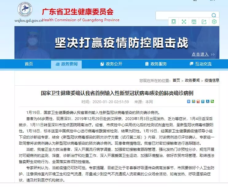 1月19日,國(guó)家衛(wèi)生健康委確認(rèn)廣東省首例輸入性新型冠狀病毒感染的肺炎確診病例。
