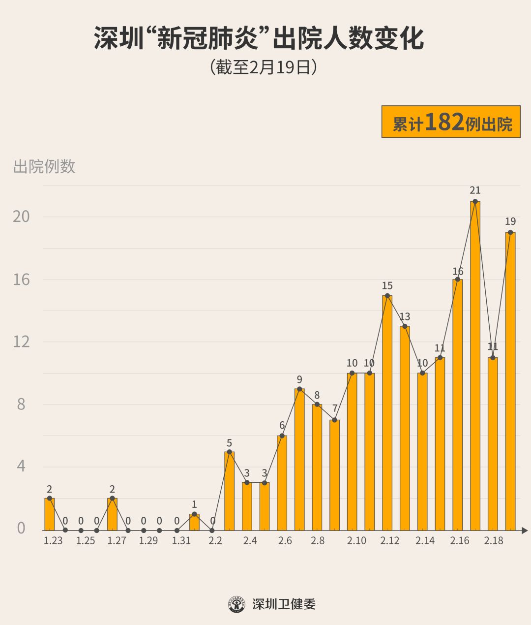 2月19日下午,經(jīng)專家組會診,深圳再有19名新型冠狀病毒肺炎確診患者出院,累計達182人,連續(xù)17天有人出院。