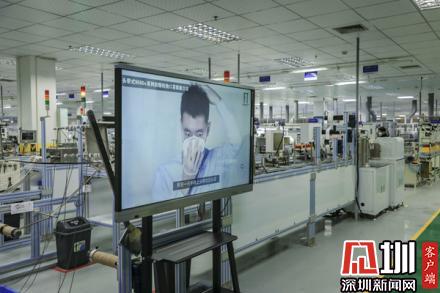 車間的一臺電視機正在播放“如何正確佩戴口罩”