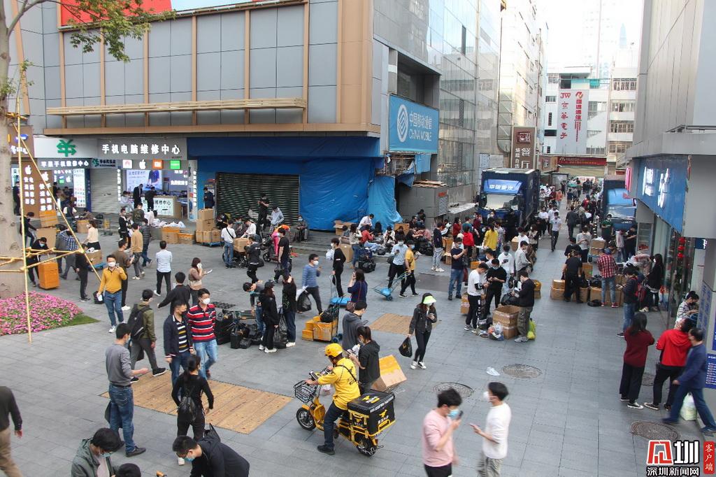 華強(qiáng)北電子商業(yè)街很多商家在拖運(yùn)貨物。