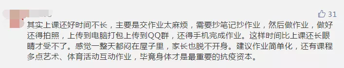 雖然網(wǎng)課兩端是老師和學(xué)生,但家長(zhǎng)的參與也必不可少。部分參與者認(rèn)為,如果沒(méi)有家長(zhǎng)的有效監(jiān)管,網(wǎng)課很難保證教學(xué)質(zhì)量,而大部分家長(zhǎng)已經(jīng)復(fù)工,無(wú)法時(shí)刻盯著孩子。有些家長(zhǎng)晚上下班后還要監(jiān)督孩子上網(wǎng)課、做作業(yè),實(shí)在“費(fèi)時(shí)、費(fèi)力、費(fèi)神”。讓孩子自己上網(wǎng)課,有些“連作業(yè)是什么都不清楚”。還有些孩子利用上網(wǎng)課的空檔玩游戲,甚至“從十七號(hào)開(kāi)始到現(xiàn)在玩游戲超過(guò)1萬(wàn)塊”。