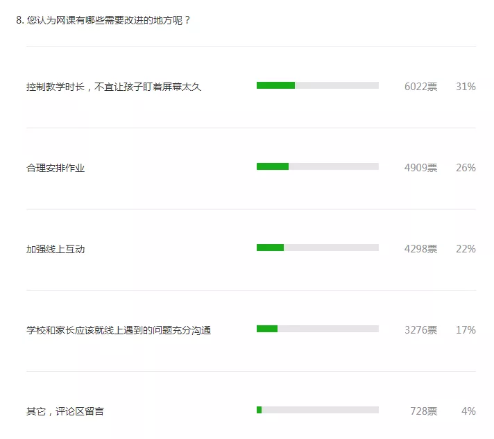 此外,22%的參與者認(rèn)為,網(wǎng)課缺乏教學(xué)氛圍,無(wú)法真正實(shí)現(xiàn)互動(dòng)式在線(xiàn)課堂。有家長(zhǎng)認(rèn)為,目前老師用群進(jìn)行講解,聊天消息過(guò)多,信息雜亂,老師無(wú)法及時(shí)答疑,建議老師通過(guò)小視頻等形式將熱點(diǎn)問(wèn)題再進(jìn)行補(bǔ)充講解。