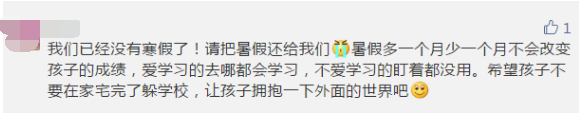 不過,也有31%的參與者投了反對票。有些網(wǎng)友呼吁:寒假已經(jīng)沒有了,希望暑假可以保留,讓孩子擁抱外面的世界。