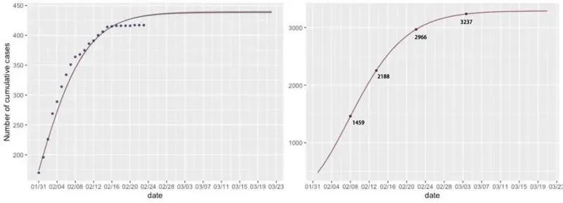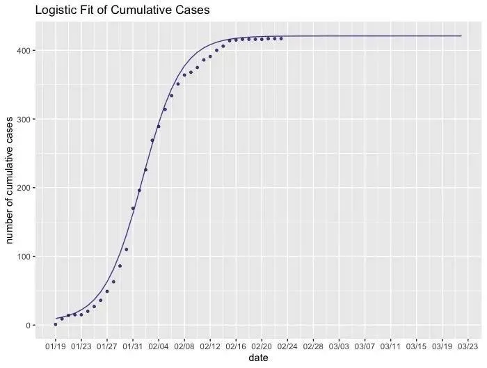 進一步地擬合深圳新冠肺炎的累計確診人數(shù),并對累計確診人數(shù)做出預(yù)測??梢钥吹?,模型預(yù)測自2月28日起病例數(shù)不再增加,預(yù)測得到最終的累計確診人數(shù)收斂在422人左右。