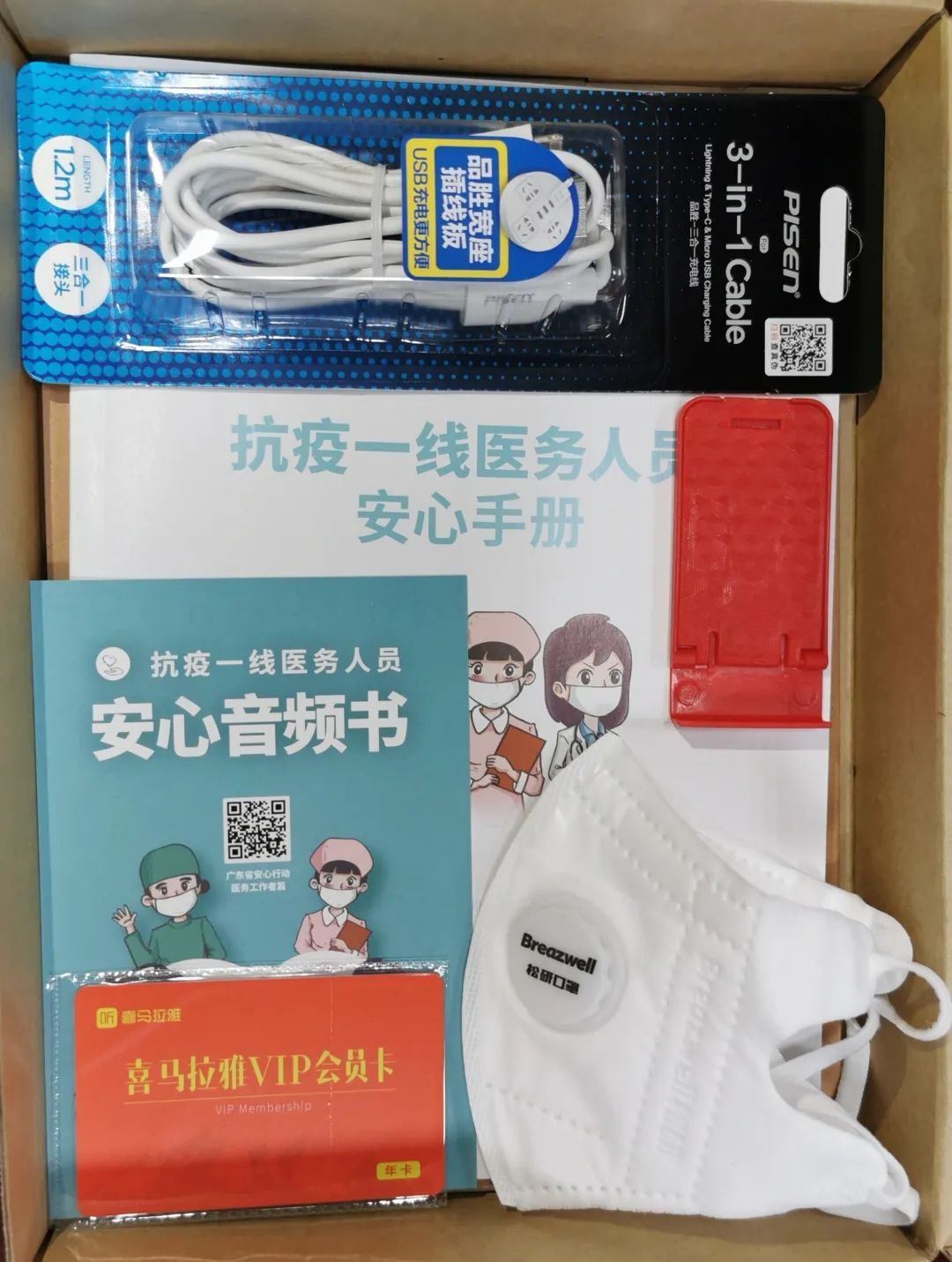 這是一個20x28cm2的普通牛皮紙紙盒,里面最顯眼的,是一本《安心手冊》,一張“抗疫一線醫(yī)務人員安心音頻書”卡,一張音頻APP的有聲書卡,和兩個N95口罩。此外,筆記本、筆、手機充電線、手機支架,也都細心地配全了。紙盒旁還放著一個小巧玲瓏的智能聲控音箱,使用者“不沾手”就能使用,防止病毒傳播。小東西里,也藏著大關(guān)愛。
