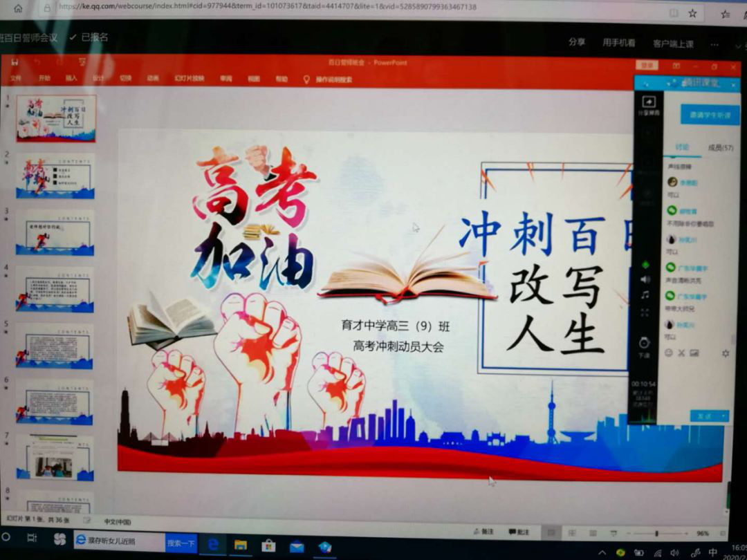 “100天,您好!麗姐的一句:‘我會一直陪在你們身邊,請轉(zhuǎn)身,去找麗姐。’讓我們眼泛淚光,這樣一次充滿愛與關(guān)懷的班會,一張全員亮相的‘線上全家?!?,帶給我們奔向夢想的力量,讓我們相互陪伴、一起成長。”高三(1)班堅信:“云月鏖戰(zhàn)箭上弦,壯志凌云正少年;礪劍磨刀值百日,劈波斬浪正當(dāng)時。”高三(6)班一位同學(xué)感言:“在時間面前,每個人都是公平的,高考也是公平的。雖然辛苦,但我還是會選擇那種滾燙的人生。這大概是唯一一個翻身機會,別停,別怕,別輸。在三四月做的事情,六七月自有答案。明年此日青云去,卻笑人間舉子忙?!?/p>