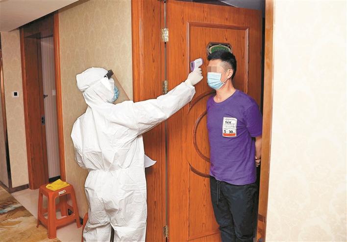 ▲醫(yī)務(wù)人員為醫(yī)學(xué)觀察人員測(cè)量體溫。深圳晚報(bào)記者楊少昆攝