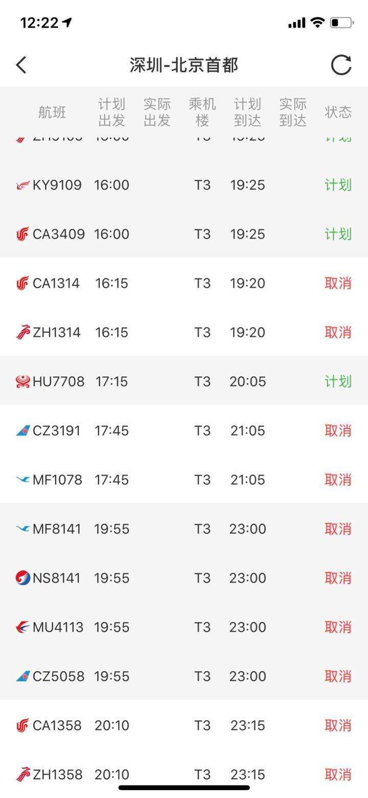不僅是深圳飛往杭州的CA1736航班,記者發(fā)現(xiàn),今晚深圳飛往北京、上海、南京等國內(nèi)多個(gè)城市的航班,均顯示為取消狀態(tài)。而原計(jì)劃17:45由深圳飛往杭州的CA1734和原計(jì)劃22:05由深圳飛往杭州的MF8384航班,均顯示為取消狀態(tài)。