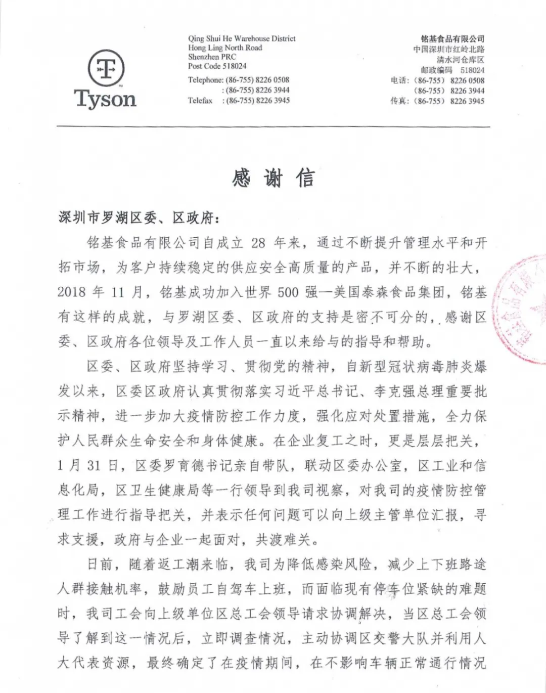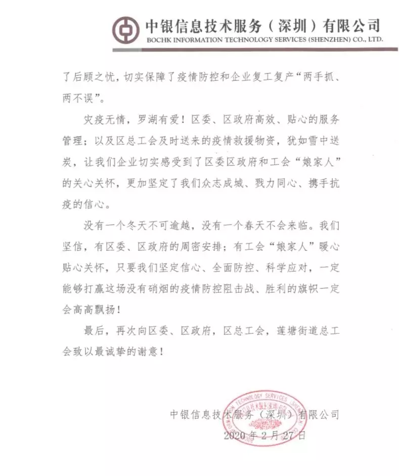 中銀信息技術(shù)服務(wù)(深圳)有限公司、銘基食品有限公司在復(fù)工復(fù)產(chǎn)后都遇到了一些困難,羅湖工會了解了他們的情況后,主動發(fā)揮工會作用,幫企業(yè)解決困難,協(xié)助他們順利復(fù)工復(fù)產(chǎn)。近日,兩封感謝信送到了羅湖區(qū)委、區(qū)政府,向羅湖羅湖區(qū)委、區(qū)政府以及羅湖各級工會為企業(yè)的付出表示感謝。
