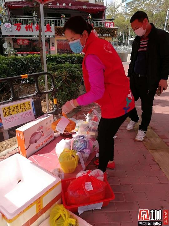 朱麗鳳在快遞點幫隔離居民送物資(左一)
