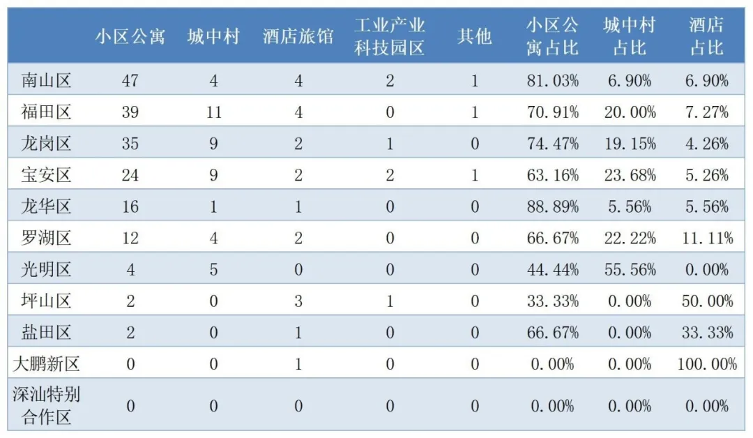 ▲福田、龍崗、寶安城中村病例較多。大鵬新區(qū)病例均在酒店旅館停留,為輸入型病例。
